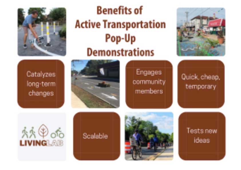 Living Lab seeks to assist Delaware local governments, community-based organizations (CBOs), and school districts in planning, executing, and evaluating active transportation pop-up demonstrations. Types of pop-up demonstrations are described below.